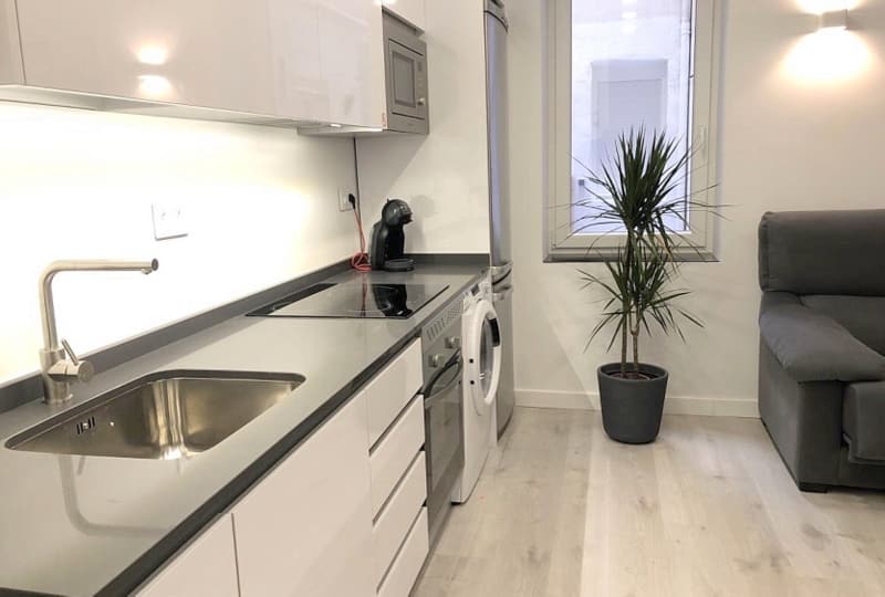 Cocina equipada con horno, vitrocerámica, nevera y lavadora